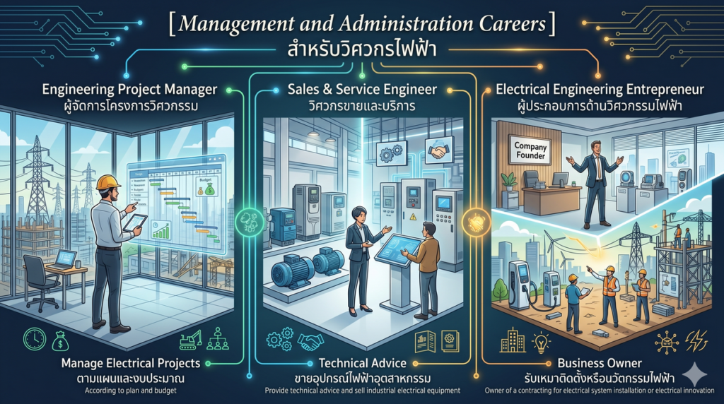 ผู้จัดการโครงการวิศวกรรม (Engineering Project Manager): บริหารจัดการงานโครงการไฟฟ้าให้เป็นไปตามแผนและงบประมาณ